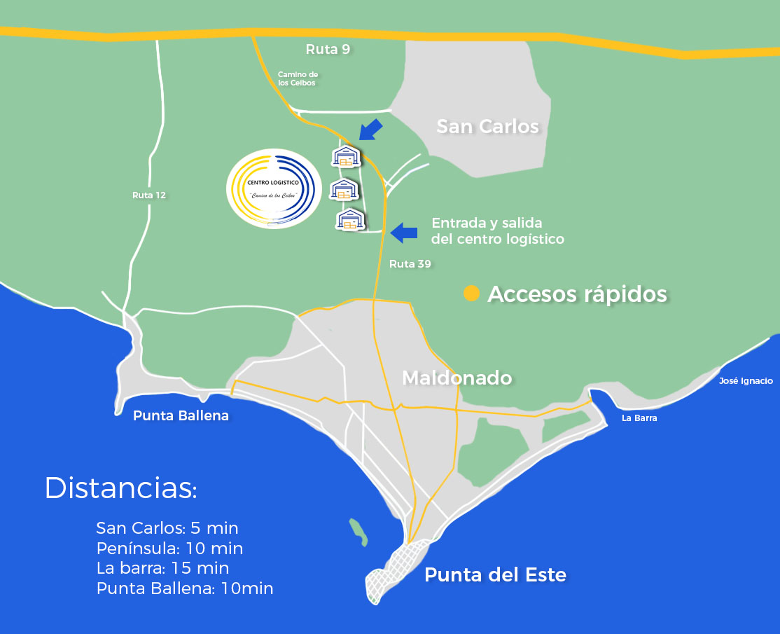 Con una ubicación clave, a pocos minutos de Maldonado y de toda la costa este, y con acceso directo a la capital del departamento a través del Camino de los Ceibos. Esto convierte al Centro Logístico "Camino de los Ceibos" en un nodo ideal para empresas que necesitan estar cerca de sus clientes y proveedores, con fácil acceso a rutas nacionales y a los principales centros urbanos de la región.